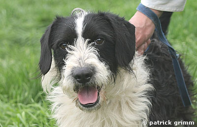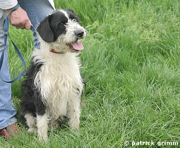 Unser schwarz-weißer Wuschel ist ein Fundhund und im Jan. 2003 geboren. Ein mittelgroßer Schnauzer-Mix Rüde, der einfach nur freundlich ist!