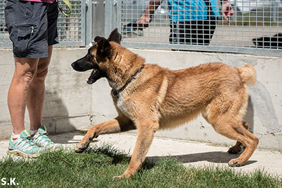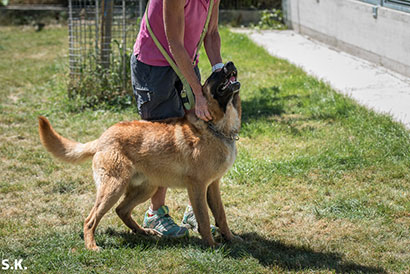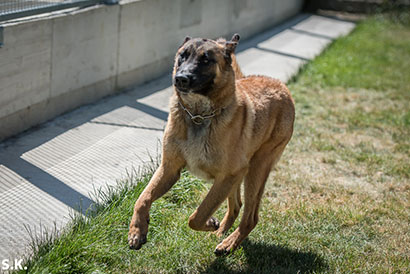 Draussen beruhigt er sich und läuft gut an der Leine.