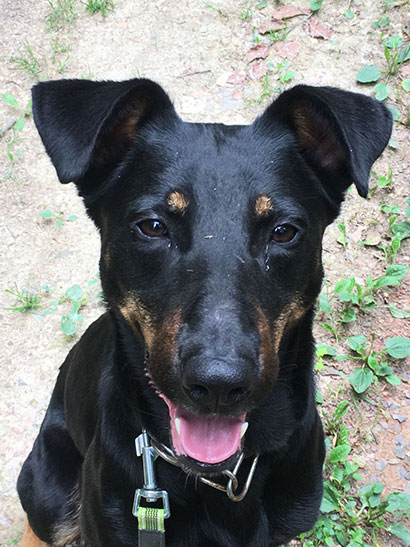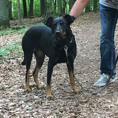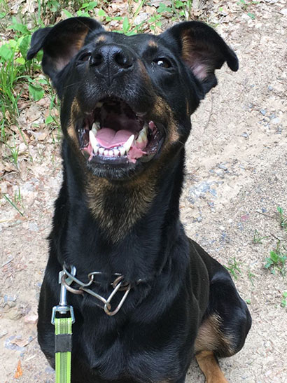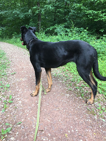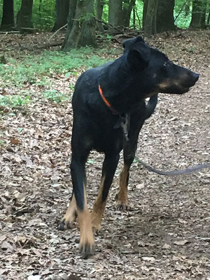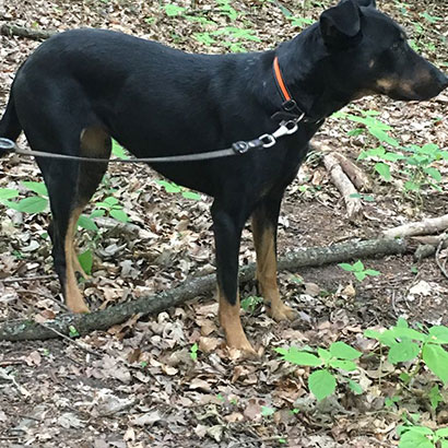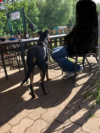 Die Runden sind sehr entspannt mit ihr, da sie nicht an der Leine zieht. Selbst davonlaufende Rehe sind ihr egal.