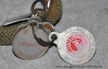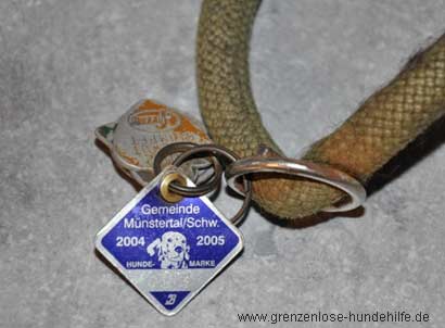 Sie waren an einem Baum angebunden und hatten einen Napf mit Wasser und Futter. Da auf der Burg keine Hunde erlaubt sind, ist es möglich, dass deren Besitzer die Zwei deshalb unten im Schatten gelassen haben. Sie trugen ein Halsband mit mehreren Impfmarken und eine Steuermarke der Gemeinde Münstertal (siehe Fotos unten). Leider konnte kein Besitzer ermittelt werden.