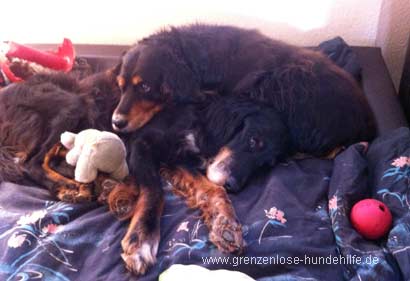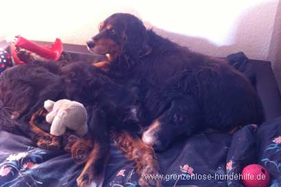Nachts lagen Nenette und Thabo immer beieinander. Da wurde gegenseitig behutsam geschnüffelt und geputzt. Nenette ist sehr führsorglich. Sie ist eine extrem liebevolle Hündin, die sehr still einfach präsent ist und gerne bei Ihren Menschen ist. Sie kann auch gut mal alleine sein und macht nichts kaputt (im Gegensatz zu Thabo ;-), da ging ein Vorleger drauf… ).