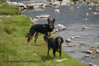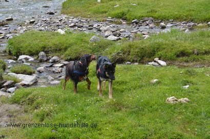 Wieder draussen schien sie die Murmeltiere nicht zu hören. Weder Esel noch Kühe beeindruckten sie. Bei anderen Hunden entschied die Sympathie, wo sie gerade war (am Bewachen im Garten (Bellen) oder Spaziergang (easy) oder wenn Thabo schon einen anbellte, dann half sie kräftig mit! Thabo hatte als Jungspund deutlich mehr Schwierigkeiten bei den Begegnungen an der Leine.