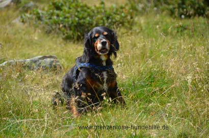 Nenette genoss die ausgedehnten Routen bei jedem Wetter und auch drei Stunden gemütliches Wandern am Stück machten ihr offensichtlich Spass. Spazierte sie mal zu weit, so holte Thabo sie zurück zur Gruppe. Auch andere Wanderer waren immer wieder sehr angetan von dieser sehr charmanten und liebevollen Hündin, die alle Liebkosungen in sich aufsog wie ein Schwamm. Einzig in zu steinigem oder zu steilem Gelände wurde Nenette unsicher, da ihre Hinterläufe etwas steifer sind und sie somit unsicher wurde. Mit dem Hundegeschirr und dem entsprechenden Griff, an dem man sie stabilisieren und entlasten konnte, fühlte sie sich schnell sicherer und arbeitete sich sehr gut die Hänge hinauf auch in etwas schwierigeren Lagen. Nenette fasste sehr schnell viel Vertrauen und machte wunderbar mit! Die Wege waren zum Teil recht anspruchsvoll.