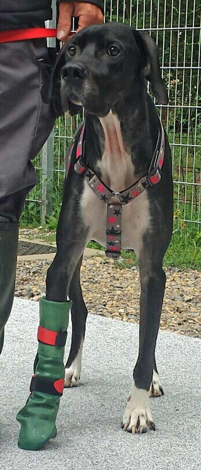Zu Myos großem Glück durfte er auf eine Notpflegestelle ziehen, wo die Wunde versorgt wird, damit sie hoffentlich heilen wird. Wenn wir das irgendwie schaffen, muß er erneut in die Spezialklinik um zu sehen, ob man armen Kerl den Fuss retten kann, indem dann zuerst mal zurück gelassenen Knochensplitter entfernt werden müssen oder ob man den Fuß amputieren muß. Es wäre sehr schön, wenn sich ganz viele Daumen und Pfötchen finden würden, die dem jungen Rüden gedrückt werden