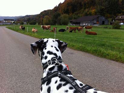 Nun ja, die Story mit dem ruhigen, tollen Landleben hat so seine Hacken... Habt ihr eine Ahnung was hier alles unterwegs ist?!? Habt ihr die ganzen Landmaschinen schon gesehen?!? Unteranderem Traktoren von klein bis riesig, mit allen möglichen Geräten zum vorne und hinten dran hängen! Dies ist so was von beeindruckend, um nicht zu sagen Angsteinflössend. Dazu kommen die ganzen Autos, Fahrräder, Fussgänger, Skater usw. da haben meine neuen Besitzer schnell gemerkt, dass ich einen sehr ausgeprägten Jagdinstinkt habe. Aber da Frauchen eine Lizenzierte Doglistener ist und beide mit mir extrem konsequent nach der Methode des Amichien Bonding arbeitet, darf mich dies in der Zwischenzeit alles passieren, ohne dass ich mir meinen Snack erjagen möchte.
