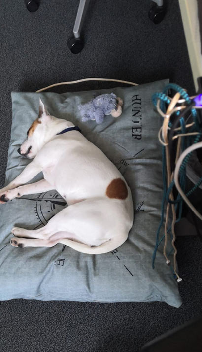 Wenn sie jedoch aufgefordert wird, dann will sie auch spielen. So hat es sich ergeben, dass sogar mein Chef schon den Flur rauf und runter rennen musste, da er sie zum spielen animiert hat.