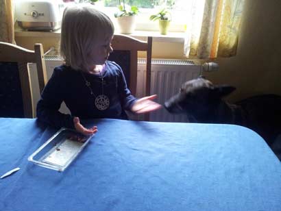 Zu Besuch ist sie super freundlich, liebt alles und jeden und alle Kinder in unserer Nachbarschaft dürfen sie streicheln und mit Wienerle belohnen *g* Sie weiss schon wie man es machen muss. Mit ihrer liebenswürdigen Art, sieht man ihr manchen Unsinn nach..... So versucht sie immer mal wieder ins Bett zu klettern, und wenn wir nicht da sind dann weiß ich, wer auf dem Sofa liegt *g* Aber mei... was solls.....soll sie doch ;)