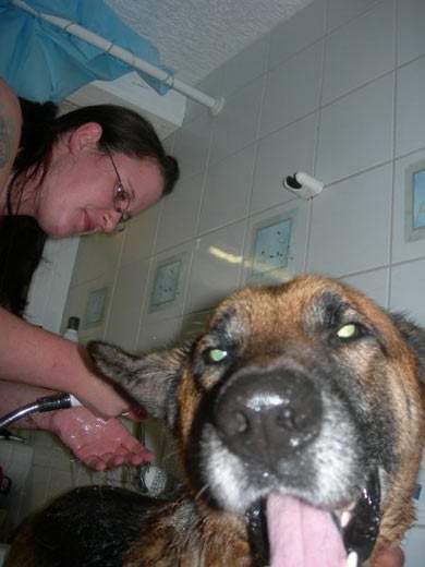 ins Badezimmer gelaufen und haben ihn abgeduscht und einshamponiert,