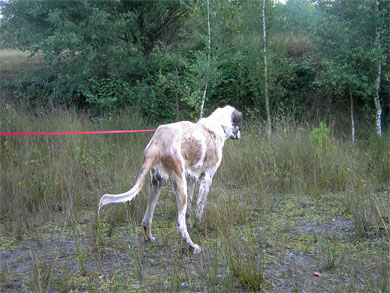 hinten so geduckt, als müsse er sein Geschäft erledigen.