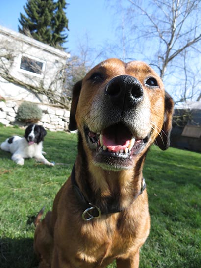 Unglaublich die Zwei! Und die 4 Enkel (2-9 Jahre) waren über Ostern auch gestaffelt da.....ein Traum! Laika ist sooo liebevoll mit Kinder und wenn sie genug hat, zieht sie sich einfach zurück...und diesen Raum bekommt sie natürlich......einfach peeerfekt! Meine Eltern blühen wieder richtig auf und manchmal muss ich fast schimpfen, dass sie Laika nicht zu fest verwöhnen und der Prinzessin nicht alles durchgehen lassen. Sie profitiert oft noch vom "armen, verlassenen Tierheim-Hund-Bonus", wenn du verstehst, was ich meine. Aber im Ernst. Sie ist eine traumhafte Hündin und ich bin mir sicher, dass sie sich wirklich gerne eingelebt hat und wohl fühlt. Anbei ein paar Bilder der letzten Zeit. Ich mache seither parallel aktiv Werbung in den Facebook-Foren für eure Seite und speziell für ein paar Hunde.....