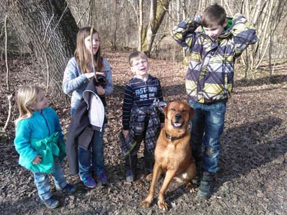 Hey Sandra, hey Michi, dieses WE habe ich mit Benji an seiner Unsicherheit gegenüber Kinder gearbeitet. Erst Zuhause mit meiner Tochter, dann heute Nachmittag mit anderen Kindern, bei denen ich wusste, dass sie alles gut umsetzen können. Er hatte riesen Spass dabei. Auf den Fotos seht ihr das Endprodukt:-):):). Er macht mir einfach nur Freude;)