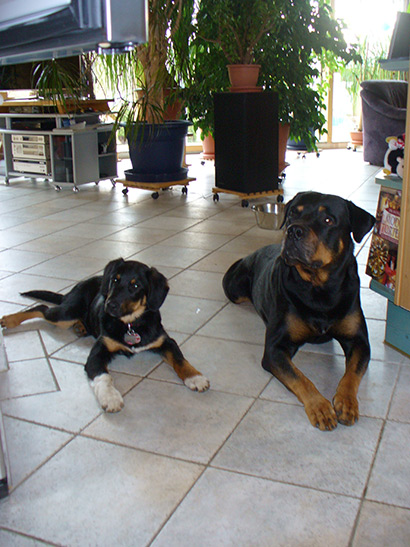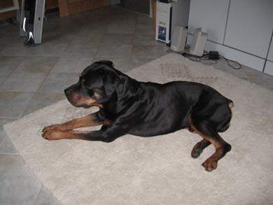 Er ist ein reiner Wohnungshund. Am Anfang dachten wir, es wäre für ihn doch bestimmt toll im Auslauf (100 qm) zu sein wenn wir nicht da sind. Pustekuchen – die Klinke hat er abgebissen. Sieg auf ganzer Linie – er hat das Haus besetzt. Als Wachhund kann man ihn nicht bezeichnen er schläft lieber. Auch fremde Leute im Garten stören ihn nicht. Er ist kein normaler Rotti. Ich glaube er hätte Katze werden sollen.