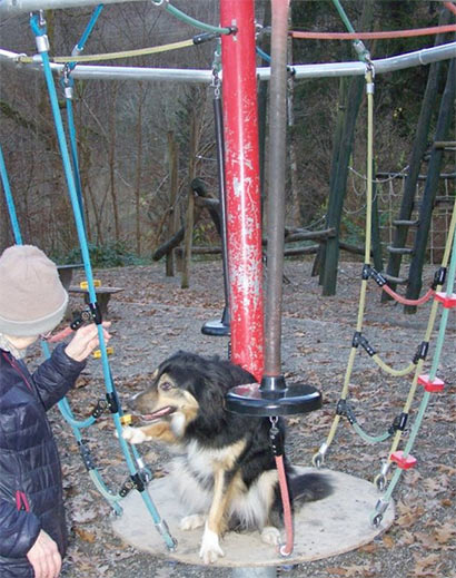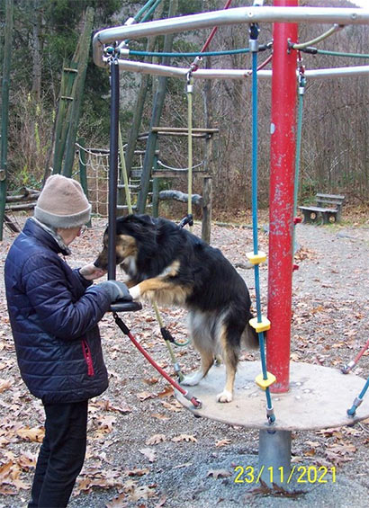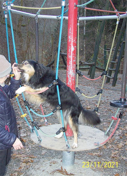 Es ist immer wieder schön zu sehen wenn wir einen seiner Hundfreunden treffen. Da kann er ganz schön aufdrehen. Beim Morgenspaziergang missbrauchen wir immer den Kinderspielplatz, da Booba gerne Karussell fährt. Davon schicke ich ein paar Bilder mit. Bleibt gesund.
