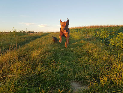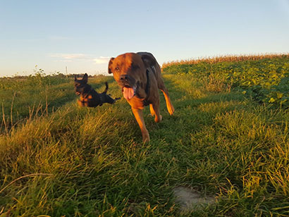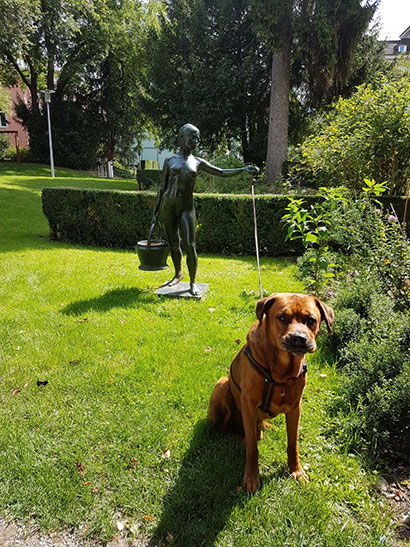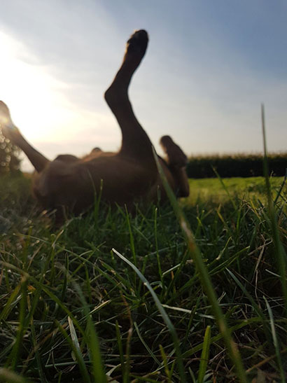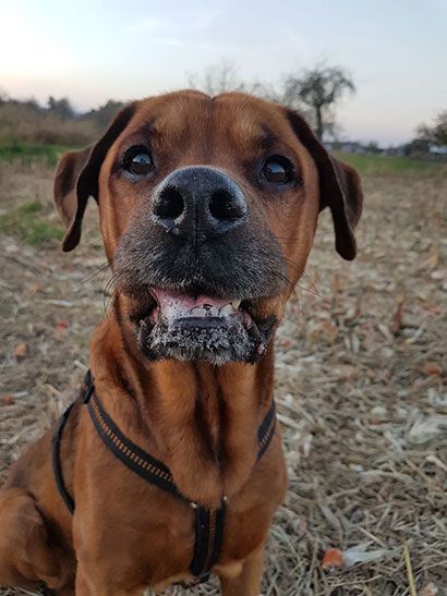 Beim Spaziergang merkt man ihm sein Alter in keinster Art und Weise an. Er rennt, bellt vor Freude, wenn er einen Hang runtersprintet. Sobald ich die Leine in die Hand nehme, parkt er rechts neben mir ein, damit ich sein Geschirr anziehen kann.