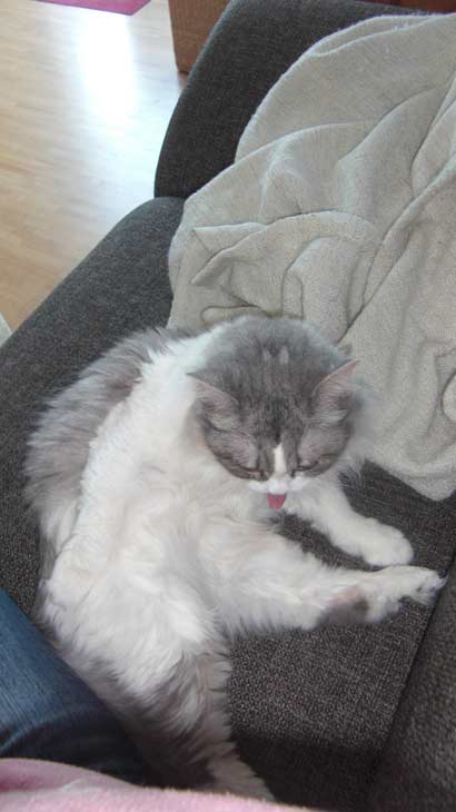 Seit gestern hat sie sich mit der Katzenbürste angefreundet, legt sich quer über meinen Schoß, lässt sich ne halbe Stunde lang durchbürsten und findet’s toll. > Klar war sie die ersten 2 Tage kritisch aber wenn man Ihre Grenzen akzeptiert (d.h. wenn sie die Ohren anlegt lässt man sie in Ruhe) ist alles prima. Sie schläft auch mit mir auf der Couch und bisher 0 Zeichen von der angeblichen Aggression. Sie liegt grad entspannt neben mir und putzt sich den Bauch (s. Foto :-)