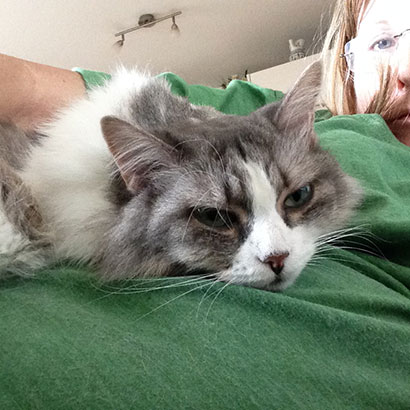 Sie will auch garnicht aus der Wohnung raus, auf den Balkon geht sie nur wenn ich mitgehe, am liebsten belagert sie mich, weicht nicht von meiner Seite und schläft gerne in meinen Arm (s. Foto).
