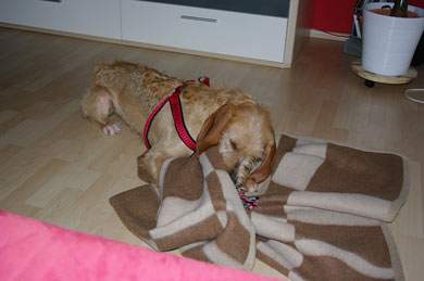 Viel lieber schleift er seine Decken durch den Raum, nagt darauf