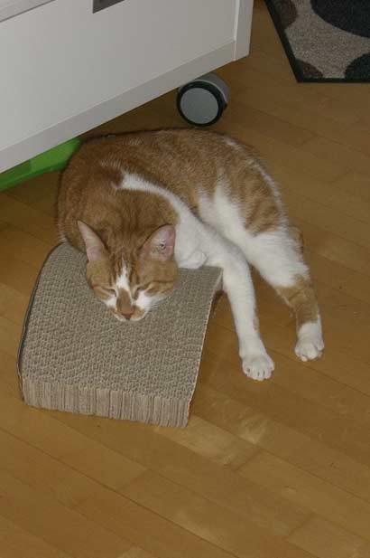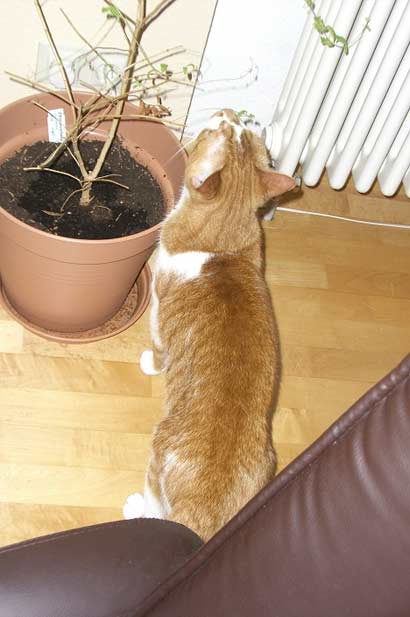 Jetzt hat es doch etwas länger gedauert, als ich gesagt habe, aber nun ein erstes Update zu Kater Caramel. Ich habe das Gefühl, dass Caramel sich schon sehr gut eingelebt hat, er ist die ganze Zeit über sehr verschmust und fordert ganz schön ein, mit zärtlichen Bissen, wenn man zu lange aussetzt. Köpfchen geben ist auch eine seiner liebsten Beschäftigungen. Bisher haben wir noch nicht viel von seinem „caractère spécial“ mitbekommen, selbst beim Tierarzt vergangene Woche war er sehr anständig. Die Handschuhe konnte ich getrost im Auto lassen. Vielleicht hat er doch mehr gelitten im Tierheim, als einem bewusst war. Wir sind den Ohrmilben zu Leibe gerückt und seither ist er nochmal entspannter, kann auch mal liegen bleiben und muss uns nicht auf Schritt und Tritt folgen. Er benutzt die Toilette vorbildlich, allerdings hält er nicht so viel vom Scharren, wenn er fertig ist, da weiß man dann gleich, wenn er auf der Toilette war, aber wir haben ja einen Lüfter J. Er hat einen großen Hang zu Grünzeug, da ist ein Gärtner verloren gegangen… Mit der Katze hat es bisher noch nicht so gut geklappt, aber sie ist auch viel unterwegs; ich denke das ergibt sich mit der Zeit. Anbei noch ein paar Fotos. Wir melden uns wieder.