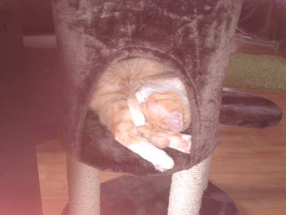 Bild 2) Sein Katzenbaum mit Höhle. (er sieht immer aus wie "um". aber er schläft in sämtlichen Positionen.)