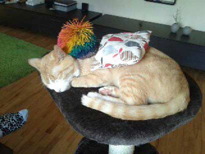 Bild 1) Sein Baldriankissen und ein Wuschelball einer Freundin von Jannik.... er schläft trotzdem weiter..