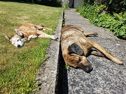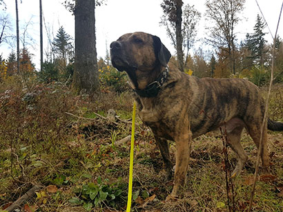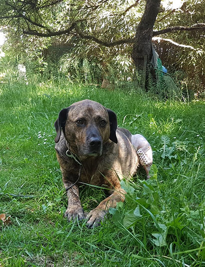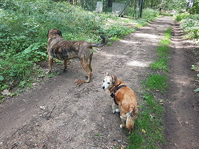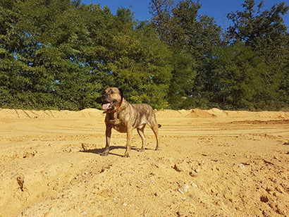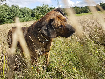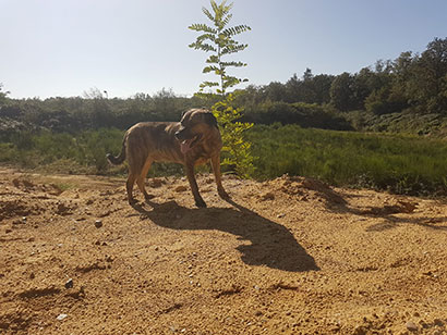 Jetzt ist alles gut - er ist ein absolut unkomplizierter Hund! In den ersten Monaten hat er gleich ein paar Kilo abgespeckt. Wir stromern fast täglich im Wald herum. Das Grundstück hier am Haus ist ihm auch sehr wichtig. Die Eichhörnchen und Wildschweine ( auf der anderen Seite des zaunes) kennen ihn gut.