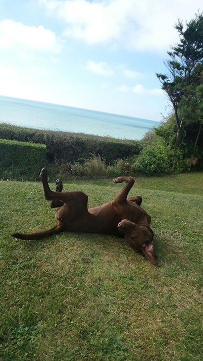 Grüsse von Chocolat von unseren Sommerhaus in der Normandie. Er liebt den grossen Garten und die Möwen.