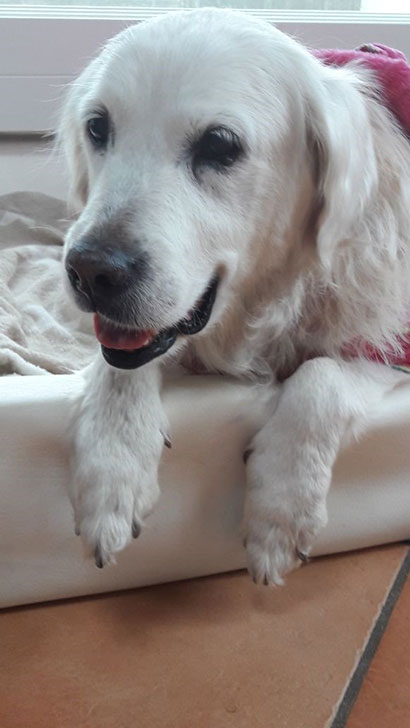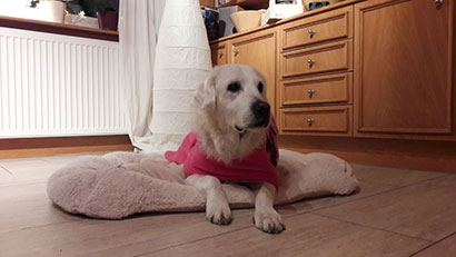 Sie hat sich ihr Bett und den Platz ausgesucht und dann die ganze Nacht durch geschlafen. Mit unseren anderen Hunden ist sie sehr verträglich und hüpft mit ihnen rum.