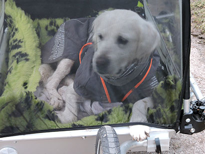 Nachdem ich nach dem zweiten Spaziergang so Muskelkater hatte, bekam ich so ein „komisches“ Ding auf Rädern nebst Chauffeur. Ich kann Euch sagen das ist ein Leben hier. Dadurch das ich überall dabei sein möchte ist dieses „komische“ Ding sehr hilfreich.