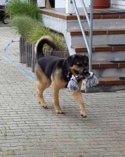 Djaba ist mittlerweile voll bei uns angekommen. Er macht sich wirklich gut. Er ist ein sehr angenehmer Hund. Er genießt sichtlich die Ruhe bei uns. Wir haben Kameras aufgestellt um immer mal wieder bei der Arbeit nach ihm sehen zu können. Wenn wir aus dem Haus gehen, geht es nicht lange und er schläft und macht es sich hierbei richtig bequem :) Er hat in den 4 Wochen schon viele Fortschritte gemacht. Im Garten können wir ihn schon ohne Leine laufen lassen. Viele Dinge in der Hund -Mensch Interaktion waren ihm anfangs fremd. Bürsten, ausgiebig graulen oder streicheln, Belohnungen... Sobald er aber verstanden hat, dass nichts Schlimmes passiert wenn man z.B. gebürstet wird dann hat er die Ruhe weg. Alle Nachbarn beneiden uns mittlerweile weil der Hund ja so still hält wenn man ihn bürstet und das an allen Körperstellen :) Er ist unheimlich aufmerksam wenn man mit ihm Übungen macht und innerhalb kürzester Zeit hat er verstanden was gefordert ist. An der Leine läuft er jetzt richtig gut und mittlerweile hat er wieder eine Nase... ich muss in der Küche nur eine Verpackung mit Fleisch aufmachen (auch geräuschlos) und zack geht es nicht lange und die Schnuppernase kommt angelaufen. Einzig Fremde machen ihm zu schaffen. Er ist ein selbstbewusster Hund hat aber wenig Vertrauen zu Menschen. Solange Fremde genug Abstand haben ist er cool, sieht nicht mal zu ihnen hin. Wenn sie nahe kommen wird er steif und geht dann nach vorne zum Attackieren. Bei Fremden die er öfter sieht wie z.B. die Nachbarn hat sich dies schon entspannt. Auch können wir dieses Verhalten unterbrechen und ihn so aus der Situation nehmen, solange der Abstand ausreichend ist. Bei uns zeigt er viel alternativ Verhalten bevor er z.B. schnappen würde (gesehen als wir ihm einen Spot on verabreicht haben – oh den mag er gar nicht :)). Aber bei Fremden zeigt er keinerlei alternativ Verhalten – er stellt sich der Situation und geht nach vorne. Das werden wir in der Hundeschule nun trainieren. Sein verhalten ist ja schon super bei Menschen die er kennt, nun muss er es nur noch bei allen Menschen so machen. Wir denken er hat eventuell wenig gute Erfahrungen bei seinem Vorbesitzer gemacht. Manche französischen Kommandos haben wir durch deutsche ersetzt, damit wir diese positiv belegen können. Es gibt das ein oder andere Kommando, da zeigt er ein sehr gedemütigtes Verhalten und versteht die Welt nicht mehr wenn man es benutzt. Z.B A ta place. Mit der deutschen Variante hatte er dann direkt kein Problem mehr und hat es gern gemacht. Naja das wird alles werden mit der Zeit.