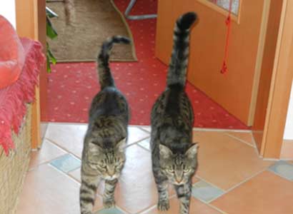 Hallo Nadine, da sich die beiden Traumkater Filou und Etienne gut eingelebt haben, sich auch schon mal ganz kurz streicheln lassen, haben sie nach drei Wochen endlich INDOOR-Freigang und dürfen alle anderen Räume erkunden, was sie auch gerne und ausgiebig machen. Begleitet werden die Erkundungstouren von Etiennes Kommentaren (da war irgendwann mal ein Siamese im Stammbaum?!); wenn man ihn nicht sieht, hört man ihn (sehr praktisch). Und wenn beide genug haben von den vielen neuen Eindrücken, lümmeln sie wieder in "ihrem" Zimmer auf "ihrem" Sofa. Die Registrierungen bei TASSO und DHR sind inzwischen eingetragen und diesen Freitag haben die beiden Impftermin (sie gehen mittlerweile ganz stressfrei in die Transportbox)... Dann ist es eigentlich nur eine Frage der Zeit, wann sie endlich mal ganz raus in den Garten können; je nach Wetterlage im Oktober/November.