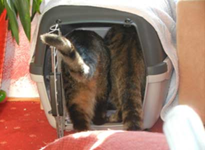 Es gab zweimal Stinkbombenalarm (Filou) und beide mussten mal pinkeln (normal bei einer so langen Fahrt; deswegen hatte ich die Streu mit in die Boxen gepackt)... ca. 18:30 habe ich beide Boxen vom Auto ins Gästezimmer gesetzt und siehe da, der Mutigere war Etienne; er hat als Erster die Nase rausgesteckt und sich umgesehen. Ich habe sie eine Stunde in Ruhe gelassen und dann die Boxen sauber gemacht, da lagen beide Kater aneinandergekuschelt unter dem Sofa, herzchenförmig, die Nasen sozusagen als Herzspitze; das hat mich bestärkt, dass es besser ist zwei zu holen, weil sie sich gegenseitig Halt geben.