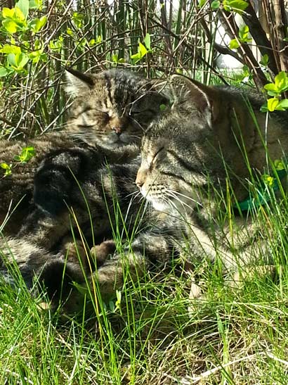 Etienne ist etwas vorsichtiger, aber ein ziemlicher Draufgänger beim Spielen und danach schön entspannt... er jammert manchmal, weil er meine anderen Katzen im Garten sieht und sooo gerne dabei sein möchte... das Gras hat beiden sichtlich Spaß gemacht, ich freue mich schon auf ihre Freudensprünge, wenn sie endlich raus dürfen!