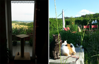 gestern abends hatte Filou schon genug davon unterm Sofa zu sitzen und saß bereits ganz entspannt auf dem kleinen Kratzbaum den ich extra mitten vor die Balkontür gestellt hatte, zum "fern sehen". Ich konnte leider nur ein Bild durch die Zimmertür machen, denn als ich mich über den Balkon angeschlichen habe, ist er abgehauen... Panik sieht aber entschieden anders aus. Als ich heute morgen vom Bäcker kam, saß er auch schon wieder auf dem Ausguck und hat Frischluft und Aussicht genossen.