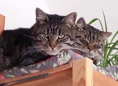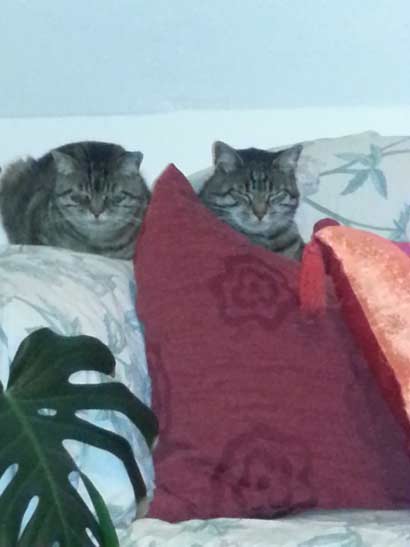 Sie zeigen keinerlei Aggression oder Scheu, ich komme auf ca. 20 cm an beide ran... mehr will ich ihnen momentan nicht zumuten, sie müssen ja erst Vertrauen zu mir aufbauen. Bilder mache ich dann, wenn es ohne Blitz gehen wird, weil ich sie nicht verschrecken will. Heute haben sie nach einem ersten Besuch von Don Camillo "Hallo hier gibt's noch mehr Sofatiger" absolute Ruhe; die (vernetzte) Balkontür ist offen, 21°C, bewölkt, also ideale Bedingungen zum "Ankommen" (siehe Anhang)!