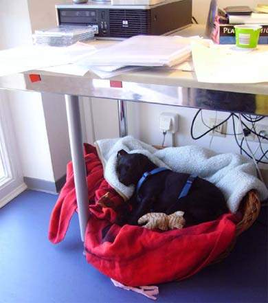 Assistent von Frauchen einen Korb unter ihrem Schreibtisch.