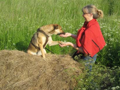 Viele Grüße auch an meine Gassigeher. Ich gehe jetzt neuerdings in die Trickschule - winken kann ich schon :-).