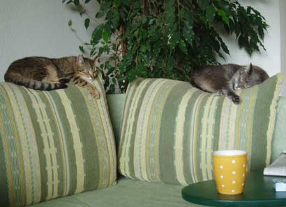 Liebe Frau Mäule, habe eigentlich gar keine Zeit, muß Ihnen aber unbedingt schreiben: Nachdem Fanny nun wochenlang mit allem und jedem (Möbelstücke jeder Art, sogar mit dem Katzenklo!) geschmust hat und seit letzter Woche auch der Wasserbettgemeinschaft mit Cilly und mir beigetreten ist, hat Fanny sich vorhin spontan entschieden, sich von mir streicheln zu lassen. Als ich Cilly über den Rücken strich, hat sie sich einfach "im Vorbeigehen" dazwischen und unter meine Hand geschoben und es sichtlich genossen, so daß sie gleich nochmals umgedreht und dann richtig "hingehoben" hat. Ein weiterer Schritt ihrer Umsiedlung nach Freiburg ist also erfolgreich verlaufen. Ich bin erleichtert.