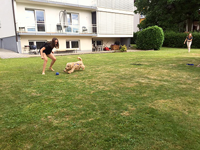Die Hundeschule macht ihm Spaß und er lernt sehr schnell und gerne. Er ist super abrufbar und kann schon sehr viele Kommandos. Das Spazieren gehen ist mittlerweile total entspannt, er läuft wirklich gut an der Leine und seit der Kastration ist er auch beim spazieren gehen nicht mehr so abgelenkt und kann es richtig genießen. Leider knurrt er ab und zu immer noch andere Rüden an.