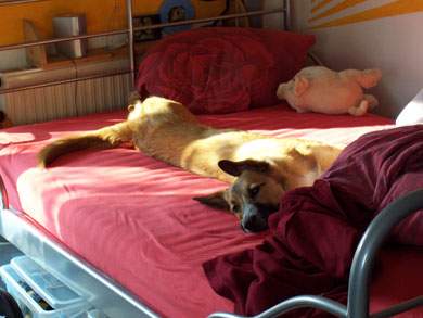 Wenn ich nicht gerade im Urlaub bin, bin ich meist in Gießen, wo auch meine beste Freundin „Amy“ wohnt. Die gehe ich auch sehr oft besuchen, denn sie ist der einzige Hund, der genauso bekloppt spielt, wie ich. Außerdem gibt es bei Amys Frauchen, die gleichzeitig meine Lieblingstante ist immer leckere Snacks! Wenn mein Frauchen arbeiten muss, habe ich das ganze Bett für mich alleine! Und das Gute daran ist, dass ich von dort immer den Nachbarshund beobachten kann, wenn ich nicht gerade schlafe. Und weil ich so gut erzogen wirken kann, durfte ich In letzter Zeit auch oft mit Frauchen zur Arbeit gehen… das hat echt Spaß gemacht! Besonders, wenn ich in Sichtweite von spannenden Behandlungen liegen durfte, gerade wenn Kaninchen (übrigens meine 2. „Lieblingstiere“ nach Eichhörnchen) an der Reihe waren. Da ist mir immer das Wasser im Mund zusammengelaufen… ich durfte aber noch nie bei der OP assistieren ;-(