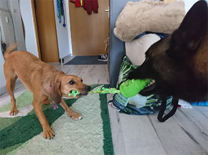 Schon beim ersten Spaziergang am nächsten Morgen, wurde uns ziemlich schnell klar, dass noch einiges an Arbeit auf uns wartet. Das er Katzen nicht mochte und an der Leine zerrte, fanden wir schon bei den Besuchen in Colmar heraus. Es gab jedoch noch ein weiteres Problem: Hundebegegnungen. Bei jeder Hundebegegnung fing er an zu winseln und zu bellen, stieg in die Leine und wollte unbedingt zum anderen Hund. Nicht aus Bösartigkeit, ganz im Gegenteil, er wollte gerne Sozialkontakte pflegen. Als er das erste Mal mit seinem besten Freund Luis dem Labrador spielen durfte, wurde uns das auch klar. Das Lustige daran, nach zwei Minuten war Luis uninteressant, und das stellte sich auch bei allen anderen Hunden raus. Zuerst toben an der Leine, danach beschnuppern und nach zwei Minuten völliges Desinteresse.