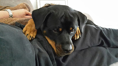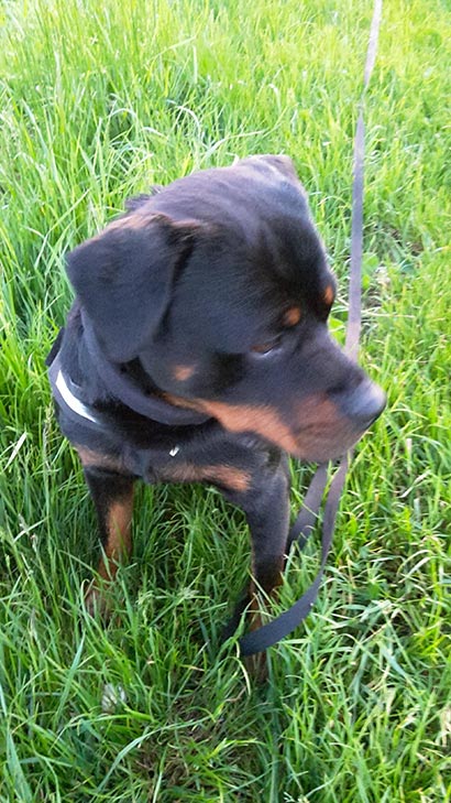 Ich bin unendlich froh, dass wir Hugo geholt haben... nach fast drei Wochen ist es schon so als wäre er immer bei uns gewesen. Er bringt uns dauernd zum Lachen und ist einfach nur ein riesiger Quatschkopf. Er liebt es mit seinem Ball zu spielen, dabei hat er in zwei Tagen gelernt, dass er ihn bringt und los lässt. Hugo lernt unheimlich schnell, er kann Sitz, Platz, gibt Pfote, lernt gerade Fuß laufen und auf die Ferne absitzen. Er ist super abrufbar und ich finde es irre, wie schnell er lernt. Hugo ist mit Menschen unheimlich lieb und anhänglich und sehr offen, er hat ein tolles, ganz sanftes Wesen und begrüßt Besucher freundlich. Manchmal ist er anfangs etwas unsicher aber das ist ok und nicht aggressiv. Er braucht dann einfach unsere Unterstützung, orientiert sich an uns. Wenn wir ihm dann zeigen, dass wir alles im Griff haben und es kein Problem gibt, ist alles in Ordnung. Er braucht einfach jemand der ihm Sicherheit gibt. Hugo hat ein kleines Problem mit anderem Hunden, er bellt, gibt dann an und baut sich auf... ich denke auch hier ist viel Unsicherheit dabei. Allerdings lässt er sich gut ablenken mit seinem Ball und trotzdem abrufen, dass kriegen wir mit Zeit und Übung also sicher auch in den Griff. Mit Hündinnen wird es glaube ich auch gut gehen, er braucht einfach noch ein bisschen Zeit und Rüden sind eben Sympathiesache. Aber sonst läuft alles super, Hugo kann ohne Probleme allein bleiben, er schläft dann und macht auch nichts kaputt. Hugo ist einfach ein rundum toller und lustiger Rotti und wir sind glücklich, dass wir ihn geholt haben.