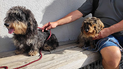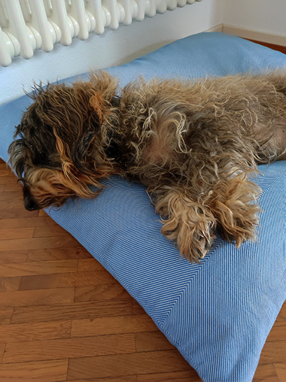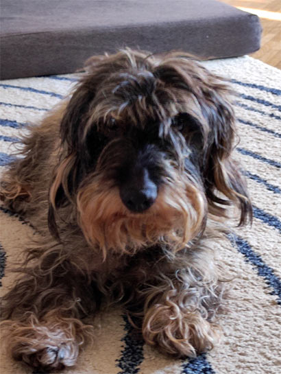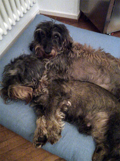 Wie das Video zeigt, gräbt sie gerne und unterstützt mich auch hin und wieder tatkräftig bei der Gartenarbeit. Unser Deli läuft gemächlich neben her, er ist mit seinen 16 Jahren mittlerweile ganz blind und taub und vermutlich auch etwas dement. Aber Hyndia zeigt ihm wo es lang geht. Bei der Fellpflege macht sie mittlerweile auch gut mit. Man sieht den Unterschied, auf den Fotos war sie noch nicht getrimmt. Das Video ist danach entstanden. Bei Rauhaardackeln ist das Trimmen wichtig, damit das Fell schön dicht wird.