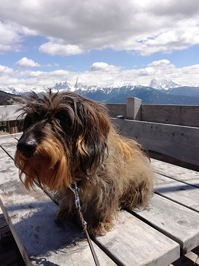 Die Fotos stammen von einem Wanderurlaub in Südtirol mit Dolomitenpanorama im Hintergrund. Hier ist Hyndia uns eine ausdauernde Begleiterin und auf den Hütten ist sie ganz brav. Auf dem Tisch sitzen darf sie natürlich nur, wenn die Hütte noch geschlossen ist. Im Sommer wollen wir ans Meer, ich bin schon gespannt, wie sie auf die Wellen reagiert.
