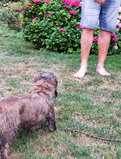 Hyndia ist immer noch unser Sonnenschein und nun mit uns eng verbunden. Sie hat ihr Revier, hier Haus und Garten, fest im Blick und verteidigt es auch. Heute hat sie leider etwas Bauchweh, vermutlich hat sie gestern etwas aufgenommen, dass ihr nicht so gut bekommt. Sie ist schon auch ein kleiner Vielfraß und man muss höllisch aufpassen. Unterwegs entdeckt sie immer wieder etwas Leckeres, was dem Hundemagen nicht unbedingt gut tut. Wir trainieren gerade "Pfui", das Kommando gibt es im französischen wohl nicht bzw. sie kennt es nicht. Dank meiner französischen Briefträgerin bin ich gut informiert, wie die Hundekommandos lauten. Jetzt können wir wieder im Garten spielen und sie liebt es das "doudou" immer wieder zu holen und ganz besonders, wenn ich so werfe, dass sie es aus der Luft fangen kann. Das Aufspüren von Leckerlies trainieren wir weiter und kombinieren mit assis, viens, ici ...