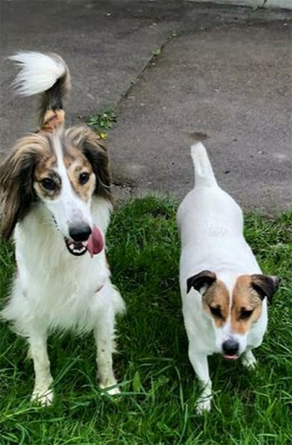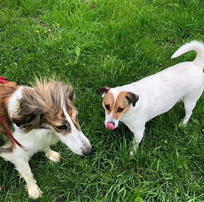 Der Bub schläft im Bett bei Herrchen Kopf an Kopf und liebt es mit seinem Hundekumpel durch den Garten zu toben.