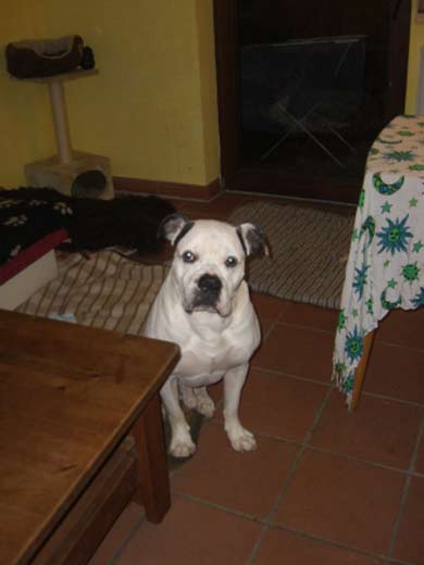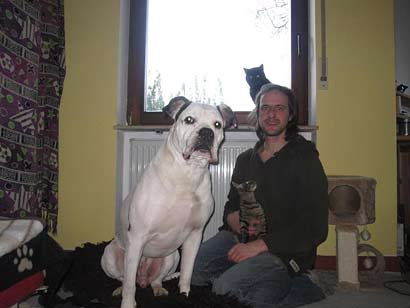 Jimmy gehts soweit sehr gut. Er wird immer gemütlicher und gammelt am liebsten auf dem Sofa. Anbei ein Foto mit seinem Katzenkumpel Patapouf die 2 Kuscheln viel zusammen und sind ein echt tolles Team geworden. Das andere Bild ist von unserem Sommerurlaub mit den Pfadfinder aus der Vauban auf einem Lager bei Heidelberg. Als echter "Wölfling" fand er das klasse, nen großes Menschenrudel mit vielen Kindern, immer an der frischen Luft sein, am Lagerfeuer einpennen und dabei schon auch mal nen Fuchs die Küche plündern lassen... Und dann noch eins, da hab ichs mal geschafft uns alle 4 auf ein Bild zu bekommen, quasi ein Familienfoto.
