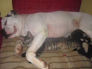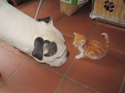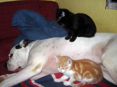 Wir haben vor 2 Wochen Zuwachs bekommen, der kleine Kater Patapouf durfte spontan bei uns einziehen da er sonst ins Tierheim gemusst hätte. Der kleine hällt uns alle auf Trab, wobei der Jimmy eine Engels gedult mit ihm zeigt. Die 2 Jungs haben sich schon richtig angefreundet manchmal spielen sie aber vorallem kuscheln sie gerne miteinander.