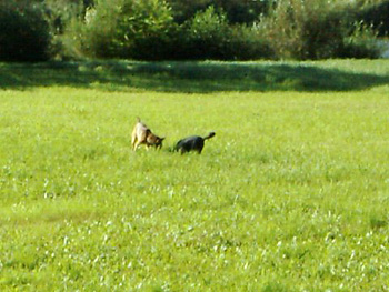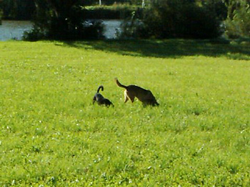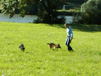 Joey und Fabian am Neckar und ohne Leine. Joey geht es wunderbar, er ist einfach ein super Hundi!