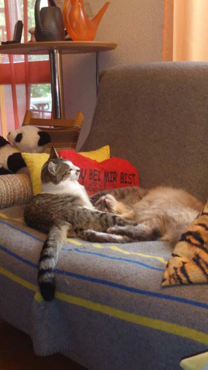 Sehen Sie selber wie sich Flecki/Julio bei uns macht. Flecki ist das Vorbild für Jimmy, er macht ihm einfach alles nach. Wie Sie selber sehen, war Flecki der Erste , der in den Kleiderschrank klettern musste und Jimmy hinterher. Sie jagen sich auch durch die Wohnung. Ab und zu kommen noch die Pfoten zum Einsatz , aber nie wirklich böse oder gar mit Krallen. Wo die beiden zusammen halten wie Pech und Schwefel ist, wenn es um das Futter geht. Da können die beiden ihr ganzes Stimmorgan einsetzten, was zu einem Katzenkonzert führt.