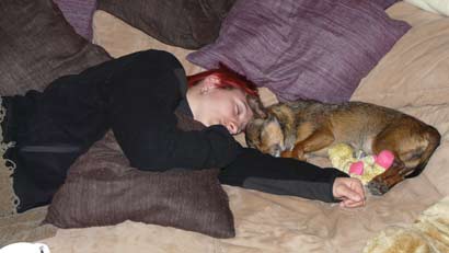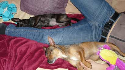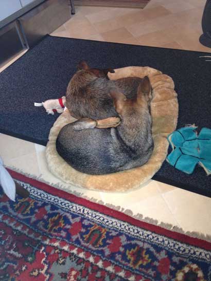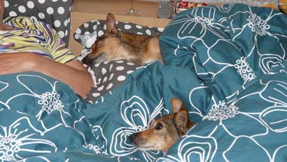 Die erste Nacht war vielleicht eine Sache, Filou hat nur gebellt und geheult. Irgendwann hat dann Frauchen beschlossen vor der Küchentür zu Schlafen das Filou merkt das noch jemand da ist. Was ich natürlich auch toll fand, den am Morgen hat sie dann die Türe einen Spalt aufgemacht so das wir beide sofort unter die Decke schlüpfen konnten! Jeeepi.